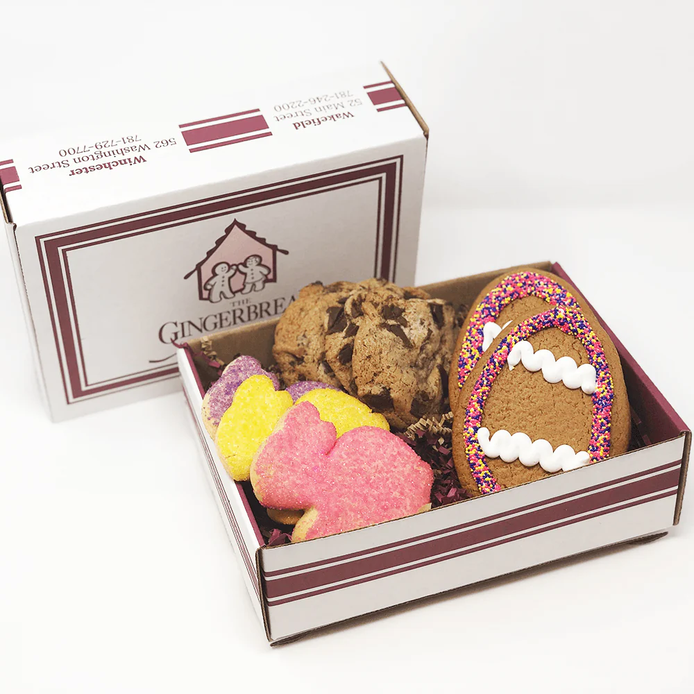A little Easter or spring time treat! Two individually wrapped gingerbread eggs, three bunny shaped sugar cookies, and your choice of either three chocolate chunk cookies or two brownies with walnuts are packed into this gift box.